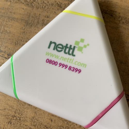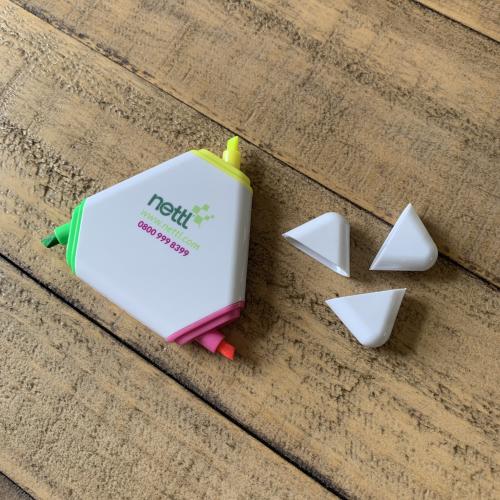 Our Triangle Shaped Highlighters have three chisel tips in yellow, pink and green ink. They can be printed in up to 4 spot colours to a 28 x 28mm area. Available in a black or white base colour.